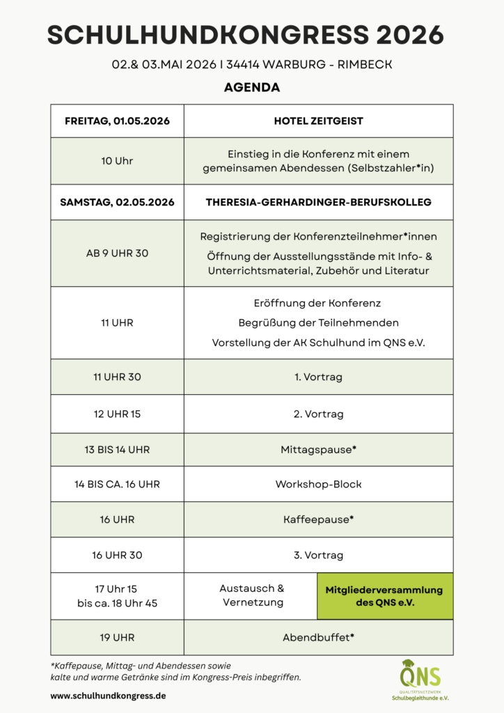 Der zeitliche Rahmen des Schulhundkongresses steht bereits fest. Die konkreten zeitlichen Zuordnungen, also wann welche Vorträge stattfinden, werden Mitte März 2026 bekannt gegeben.